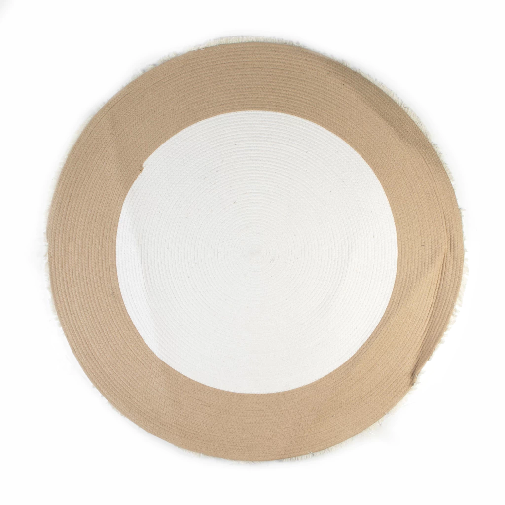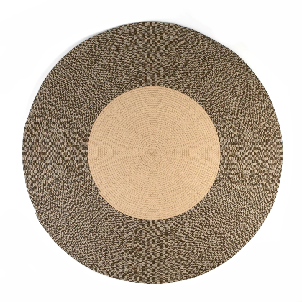 Alfombra redonda trenzada de yute con diseno al rededor.