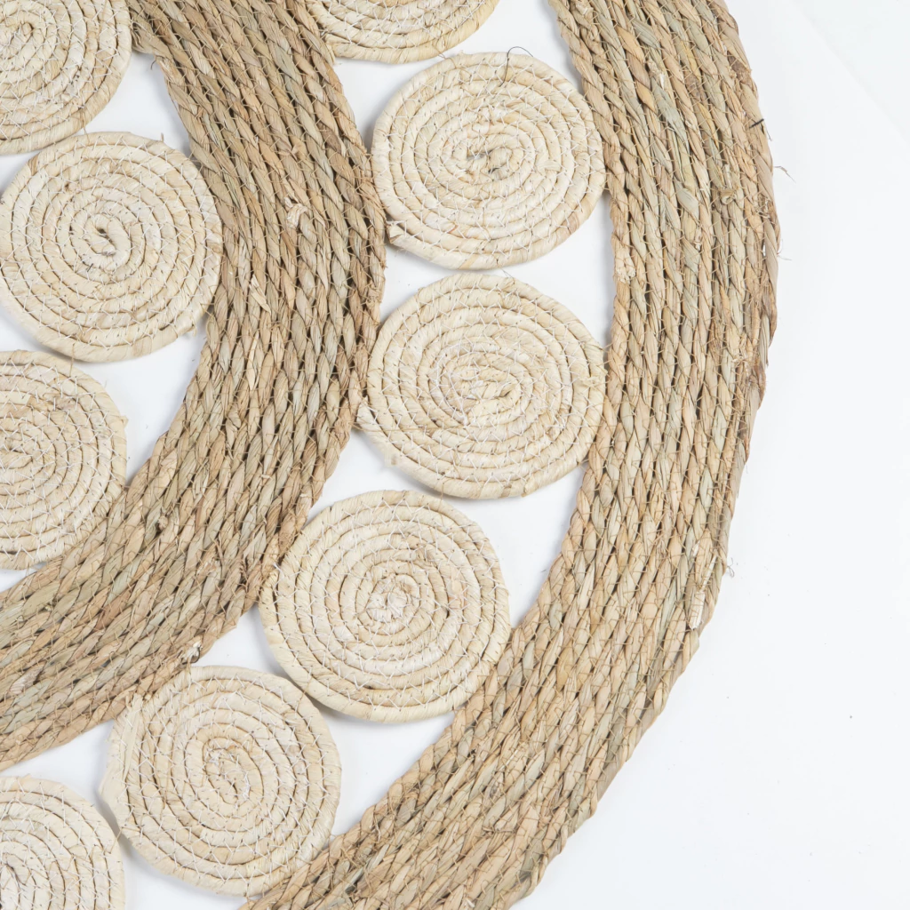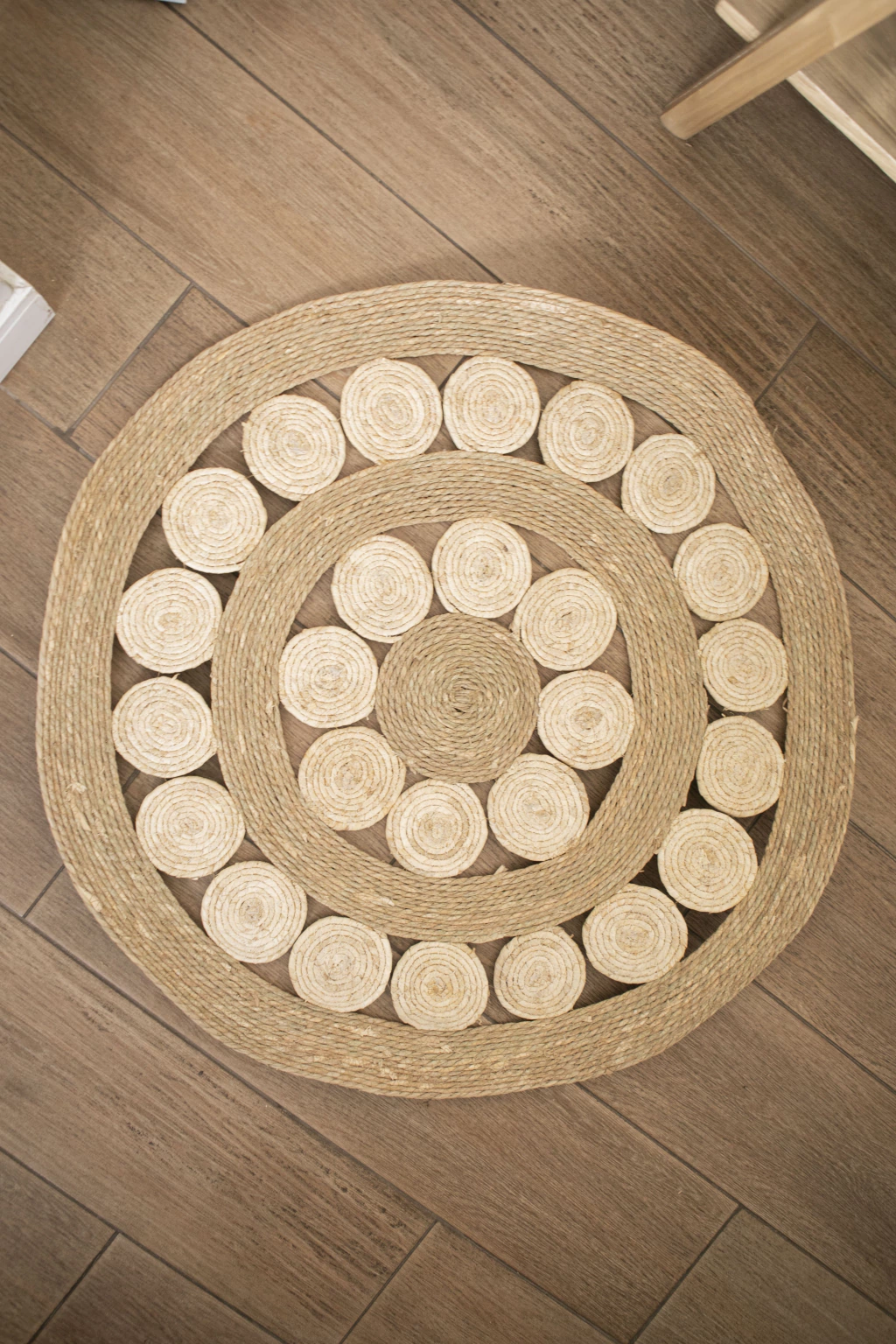 Alfombra redonda trenzada de yute con diseno al rededor.