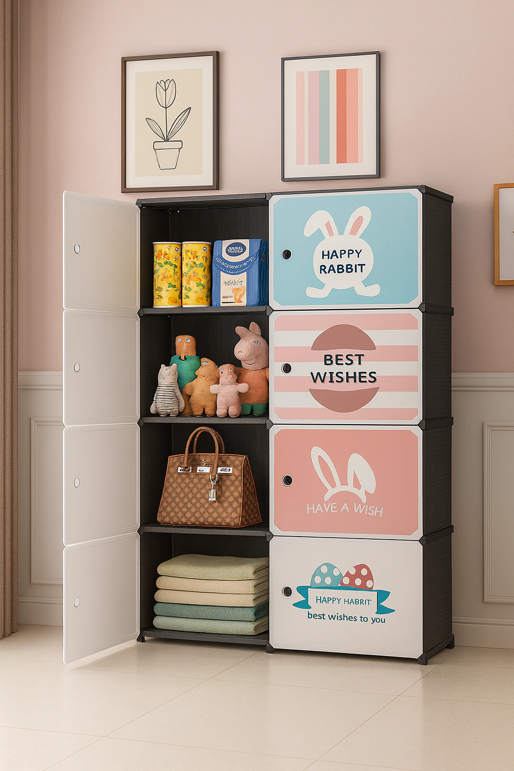 -Materiales: Confeccionado en tela y plastico-Medidas: 124 cm x 82 cm x 29 cm alto-Contiene 8 cubos cuadrados para guardar cosas.- Viene con conectores para su armado, paneles y puertas.