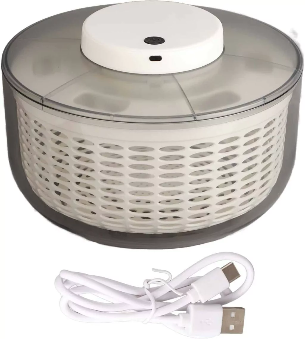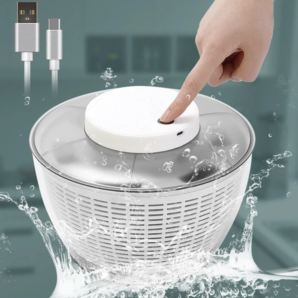 Contiene un giratorio eléctrico de verduras con carga USB, larga duración de la batería, arranque con un botón, parada automática de 20 segundos después de abrir, puede secar rápida y fácilmente verduras y frutas, ahorra tiempo y alivia tus manos.