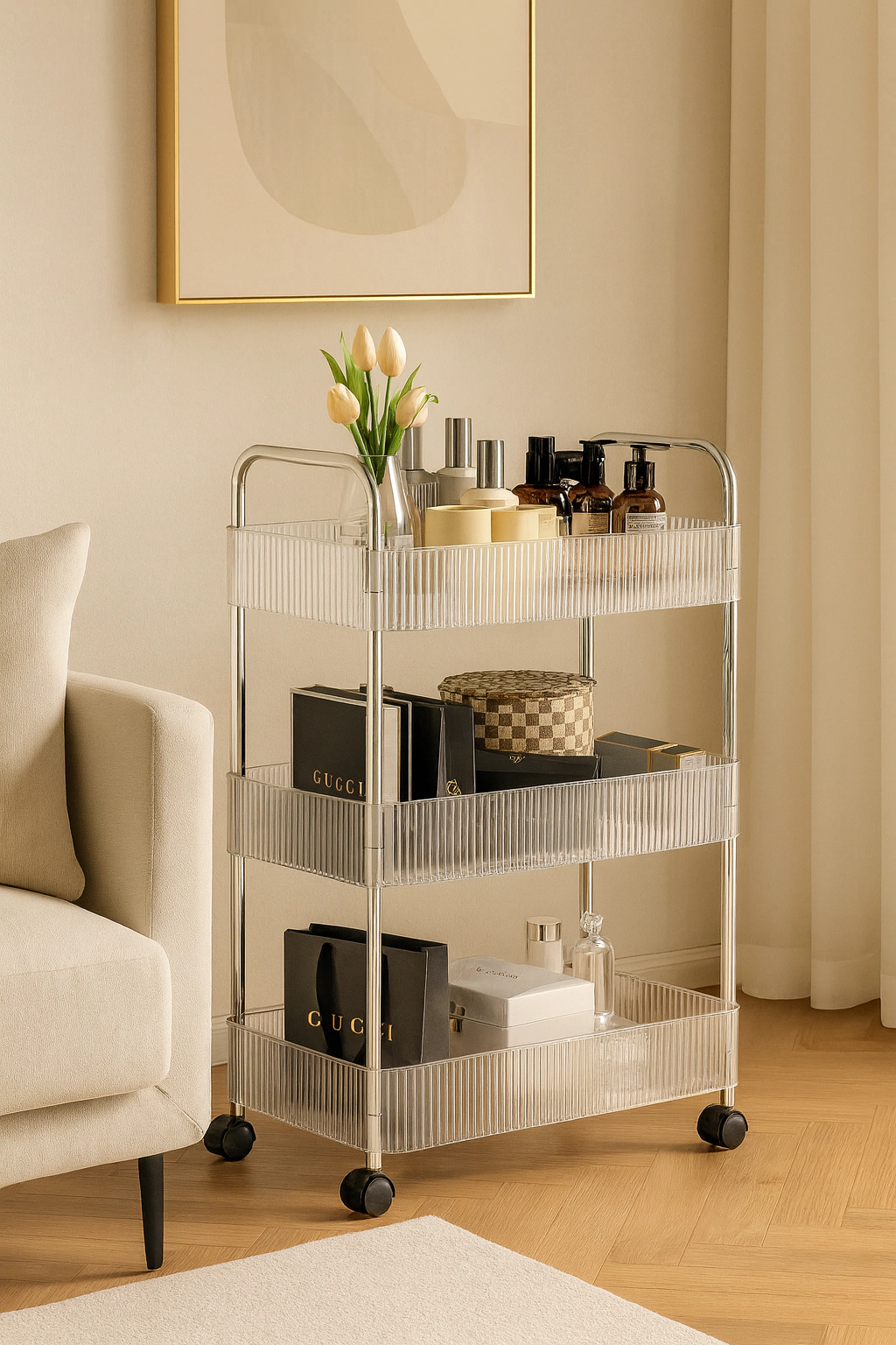 1 X Carrito 3 niveles con ruedas Acrílico transparente premium. Medidas