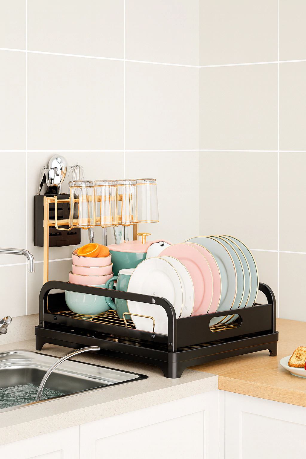 Caracteristicas:Material: Acero inoxidable con plasticoMedidas: 42,5 cm ancho x 30,5 cm profundidad x 34,5 cm alturaColor: Negro con doradoNiveles: 1Incluye seca vasosIncluye cubiertero