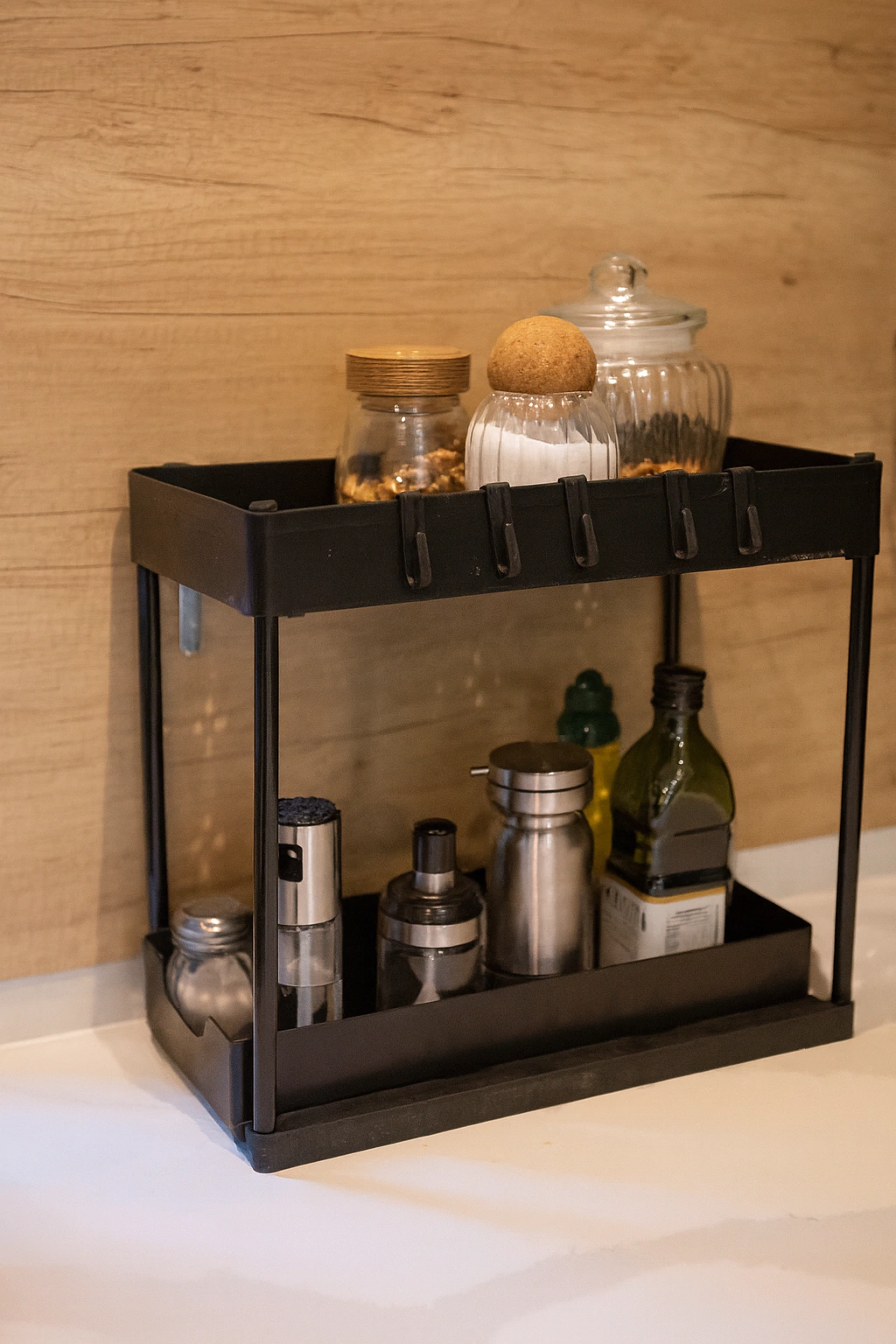 Características del producto:Medidas: 40 cm largo x 22 cm ancho x 35 cm altoMaterial: PlasticoColor: Blanco/negroNúmero de niveles: 2 nivelesIncluye 4 ganchos