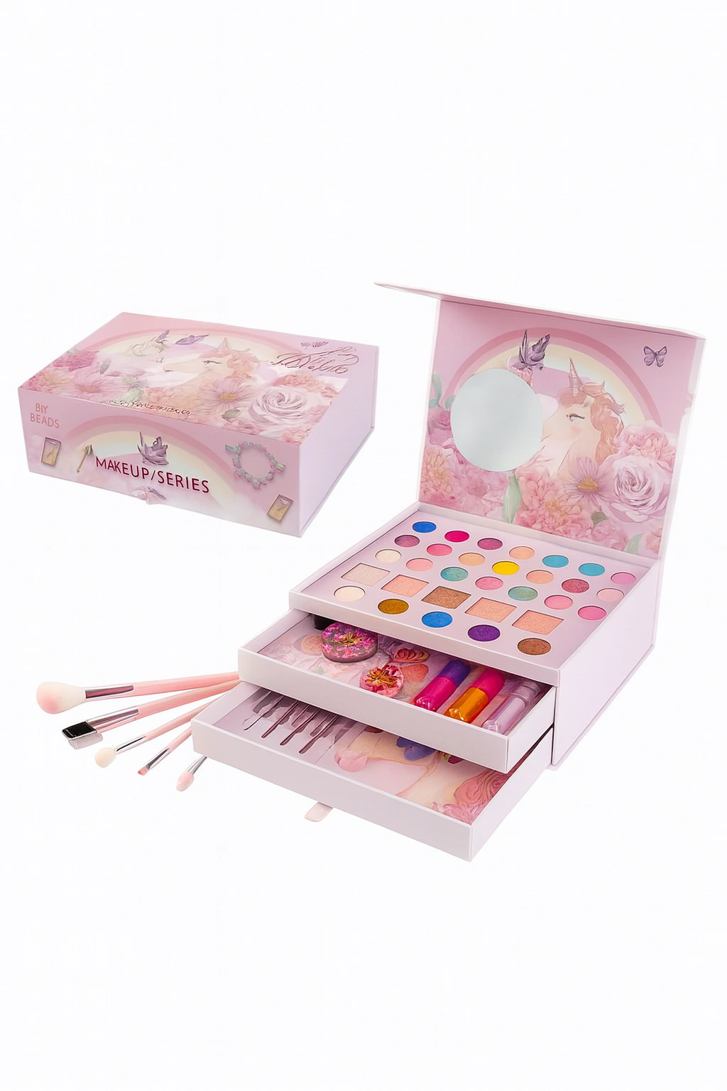 Un kit de maquillaje mágico ideal para niñas, presentado en una hermosa caja rígida decorada con unicornios, flores y tonos pastel. Incluye múltiples sombras de colores, brillos, labiales, accesorios y mini brochas, distribuidos en compartimentos y cajones fáciles de abrir.