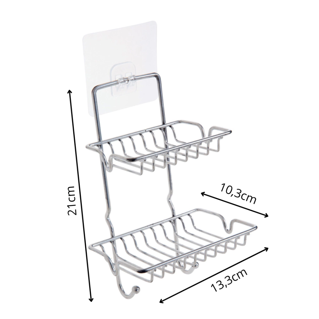 Caracteristicas Material: MetalMedidas: 13,3cm ancho x 10,3cm profundidad x 21cm alturaColor: Plateado / BlancoCantidad de estantes: 2Cantidad de ganchos: 2Se instala con ganchos autoadhesivos, los cuales vienen incluidos en la compra