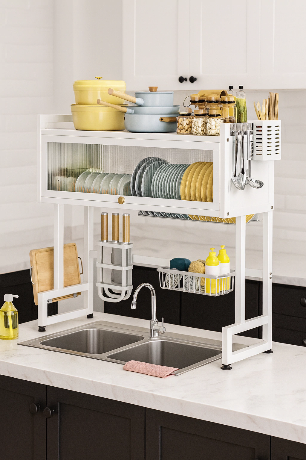 Pisos / Niveles: 1 nivel Con estante con puertaIncluye porta cubiertos, porta cuchillos y portatablasColor: Blanco
