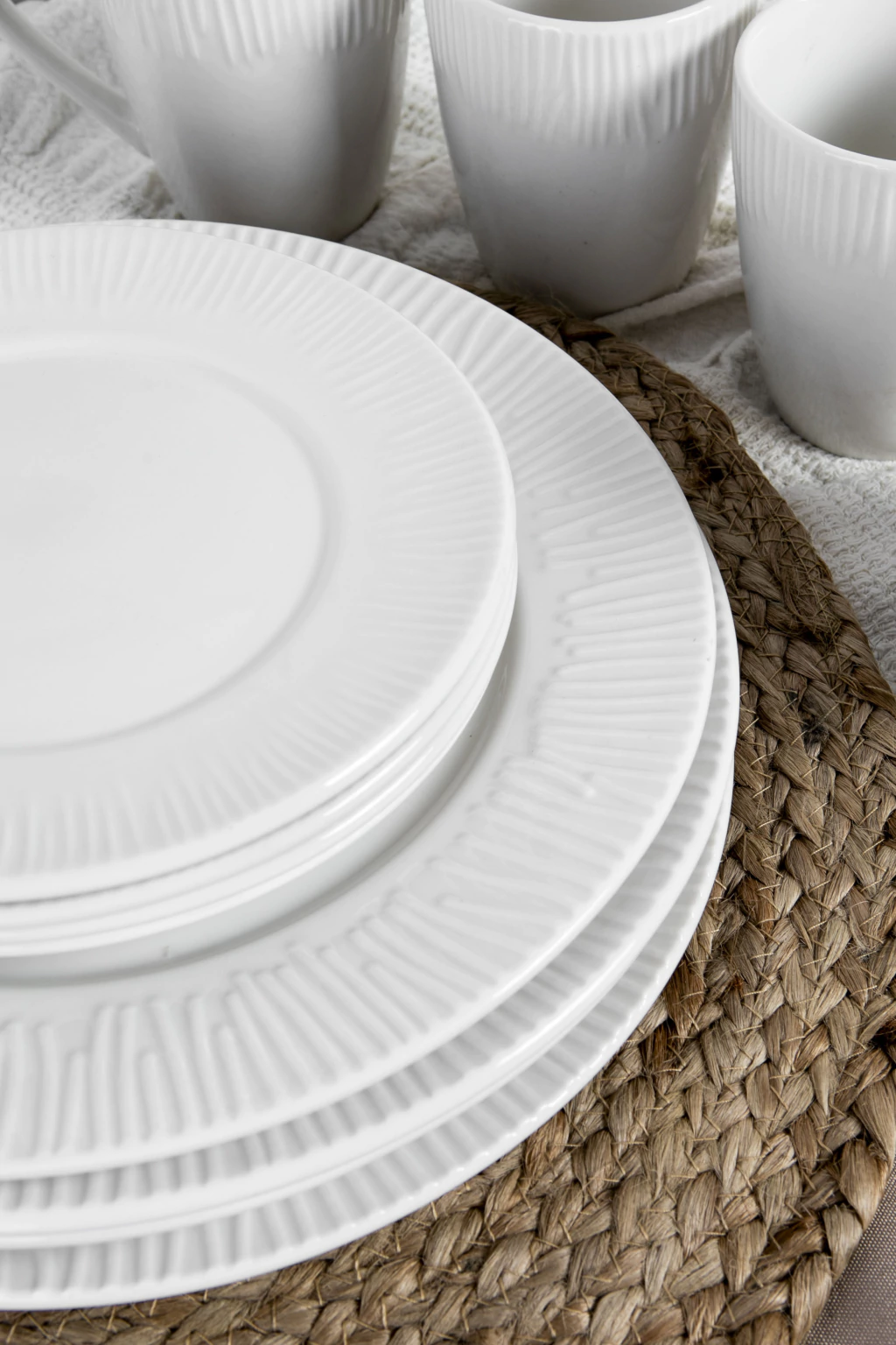 Viene en caja (peso de la caja 7.25 kg).Incluye:- 4 platos playos de 26.5 cm de diámetro- 4 platos hondos de 23 cm de diámetro- 4 platos de postre de 19 cm de diámetro- 4 tazas 8.5 cm diámetro x 9.5 alto