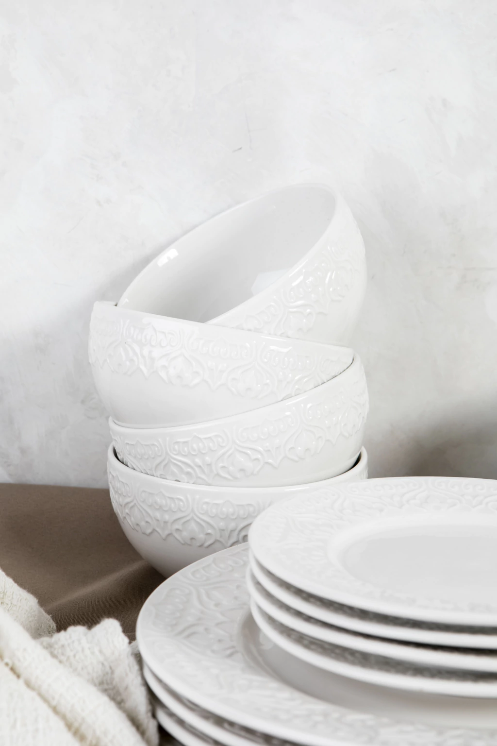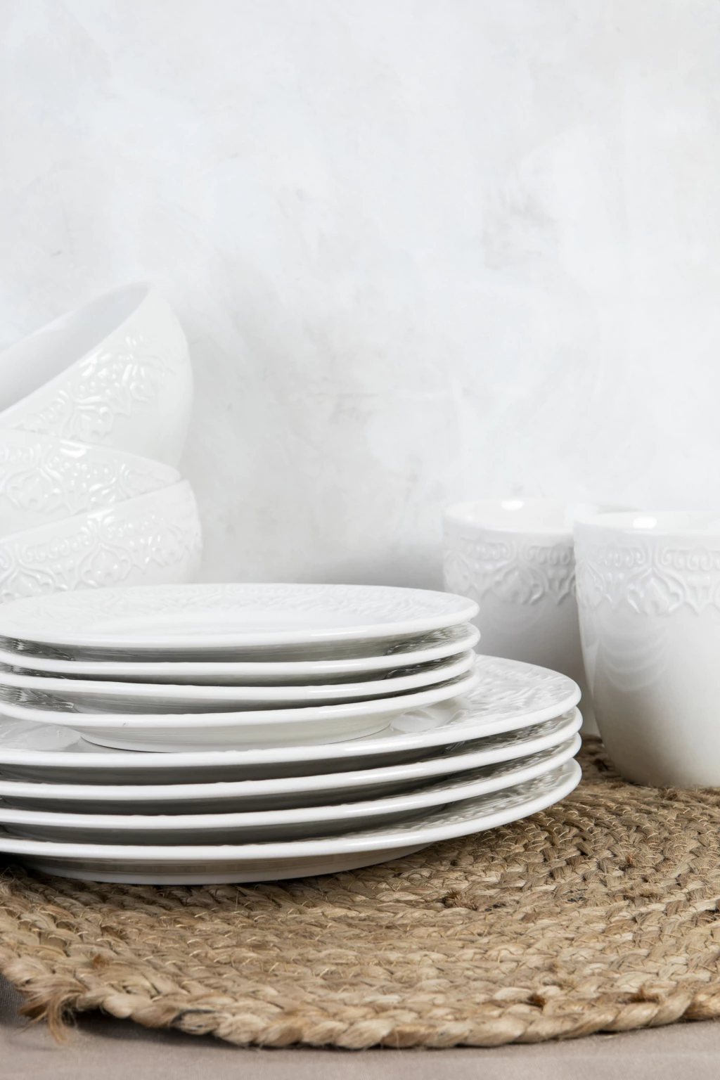 Set x16 piezas de vajilla porcelana blanca.Viene en caja (peso de la caja 7kg).Incluye:- 4 platos playos de 26.5 cm de diámetro- 4 Bowls de 14 cm de diámetro- 4 platos de postre de 19 cm de diámetro- 4 tazas 8.5 cm diámetro x 10 alto