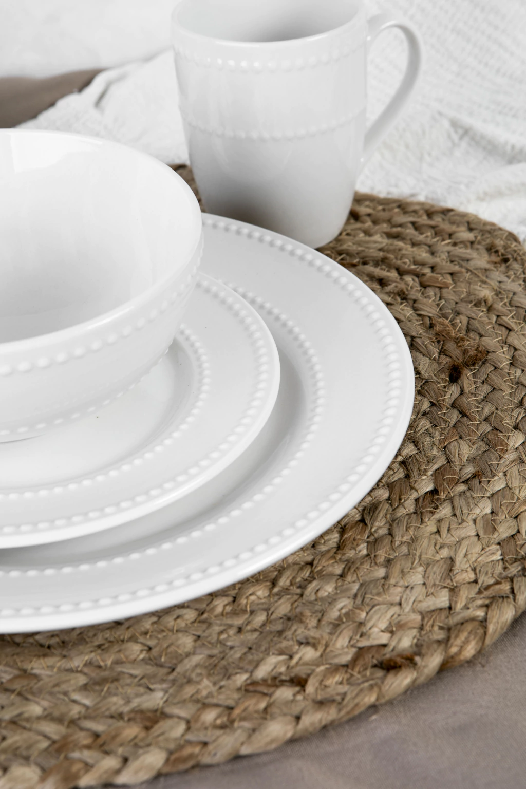 Set x16 piezas de vajilla porcelana blanca con detalles y estilo Viene en caja (peso de la caja 7 kg aprox). Incluye: - 4 platos playos de 26.5 cm de diámetro - 4 bowls de diámetro 15 cm - 4 platos de postre de 19 cm de diámetro - 4 tazas 10 cm alto x 8 cm ancho