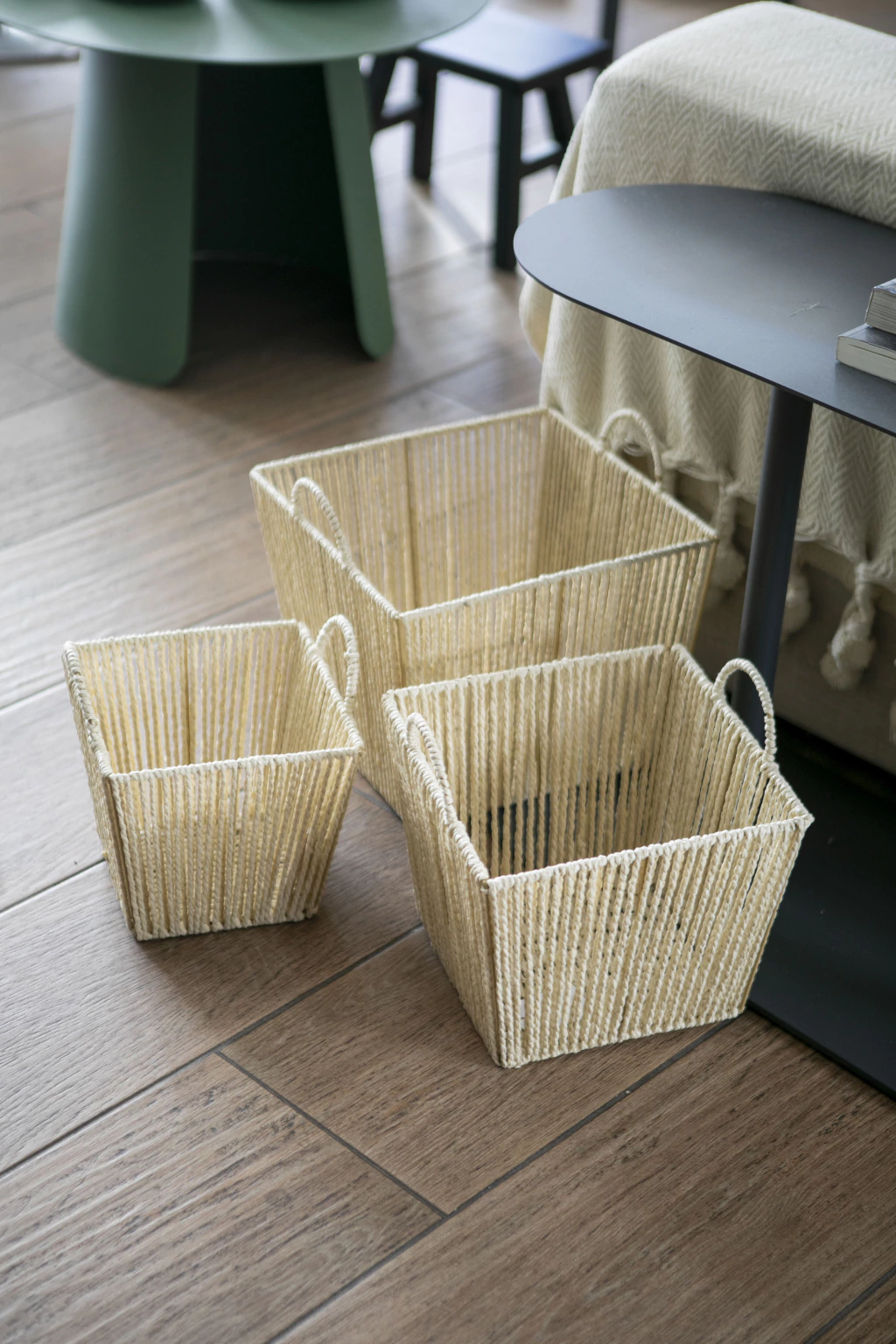 Medidas:Canasto grande: 30 cm largo x 30 cm prof x 23 cm altoCanasto mediano: 26 cm largo x 26 cm prof x 20 cm altoCanasto chico: 22 cm largo x 22 cm prof x 18 cm alto