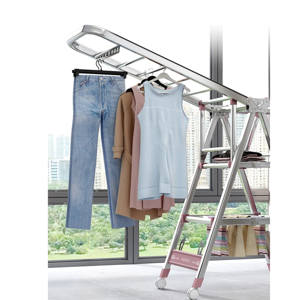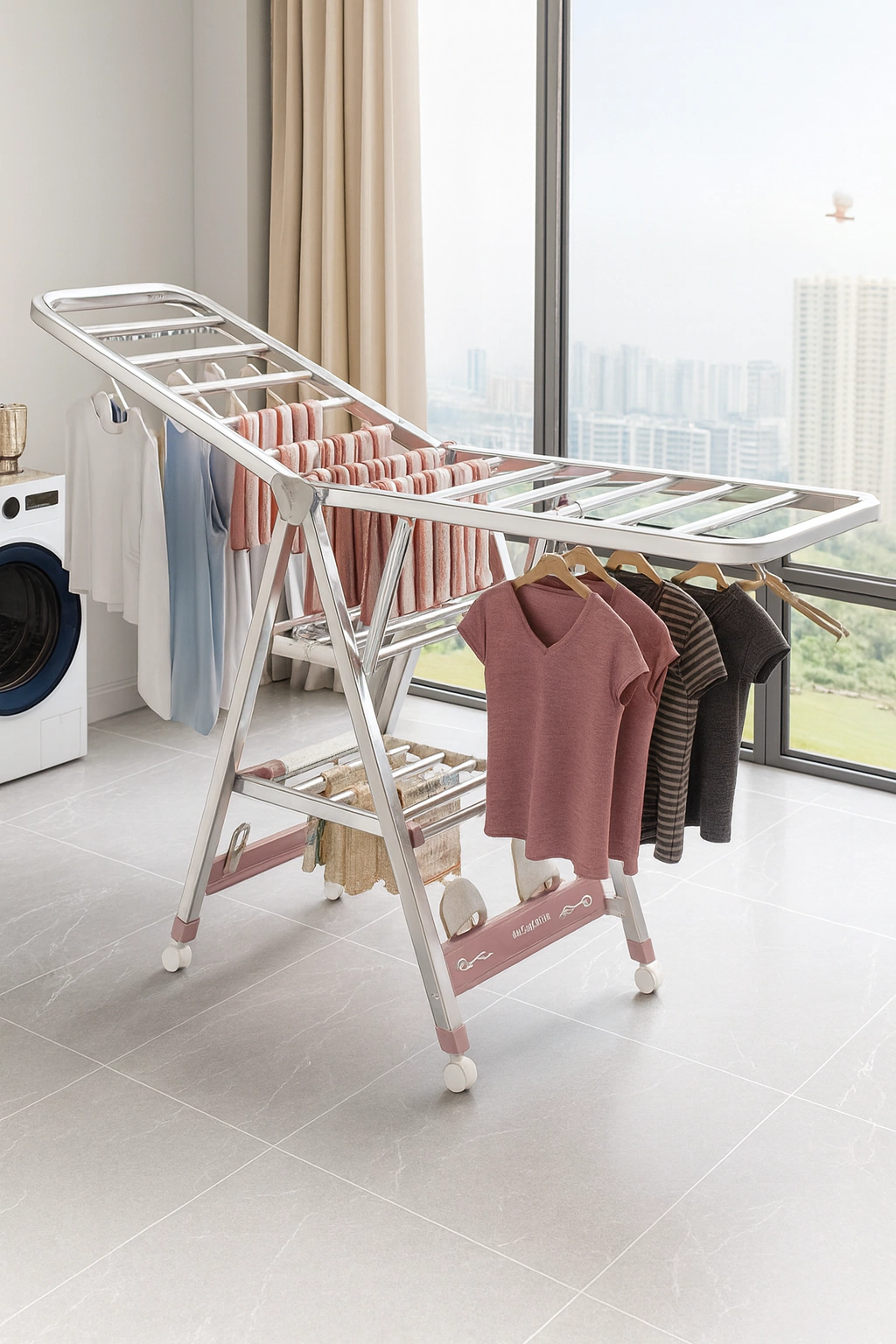 Este tendeder de tres pisos con dos alas, plegable y con ruedas, es una solución práctica y versátil para secar la ropa en espacios más pequeños o donde no hay espacio para un tendedero de pared tradicional.